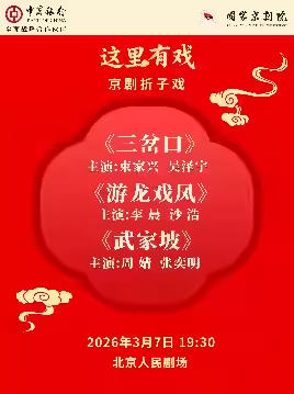 国家京剧院“这里有戏”京剧折子戏《三岔口》《游龙戏凤》《武家坡》 时间:2026.03.07 周六 19:30 场馆:北京市 | 北京人民剧场 票价:100/180/280 电话订票:010-66552100,010-66552258 微信订票:18515362586