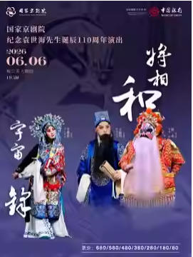 国家京剧院纪念袁世海先生诞辰110周年演出《宇宙锋》《将相和》 时间:2026.06.06 周六 19:30 场馆:北京市 | 梅兰芳大剧院-大剧场 票价:180/280/380/480/580/680 微信订票:18515362586 电话订票:010-66552100,010-66552258