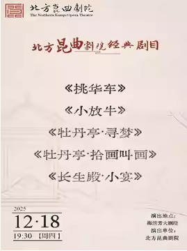 北方昆曲剧院经典剧目展演《挑华车》《小放牛》《牡丹亭·寻梦》《牡丹亭·拾画叫画》《长生殿·小宴》 时间:2025.12.18 周四 19:30 场馆:北京市 | 梅兰芳大剧院-大剧场 票价:100/160/260/360/460 微信订票:18515362586 电话订票:010-66552100,010-66552258